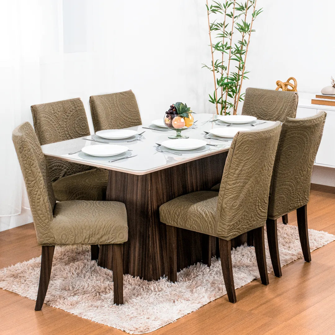 As capas para cadeiras acolchoadas da Charme são desenvolvidas com tecido de malha flexível de tamanho único, e por isso possuem excelente ajuste nos principais modelos de cadeiras. Confira medidas a seguir!