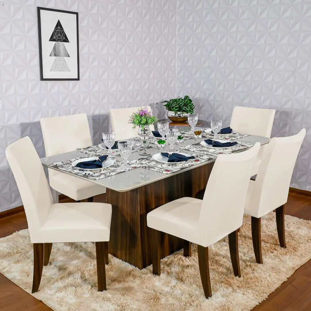 A capa para cadeira de jantar impermeável bege da Charme se adapta a diversos modelos de cadeiras.