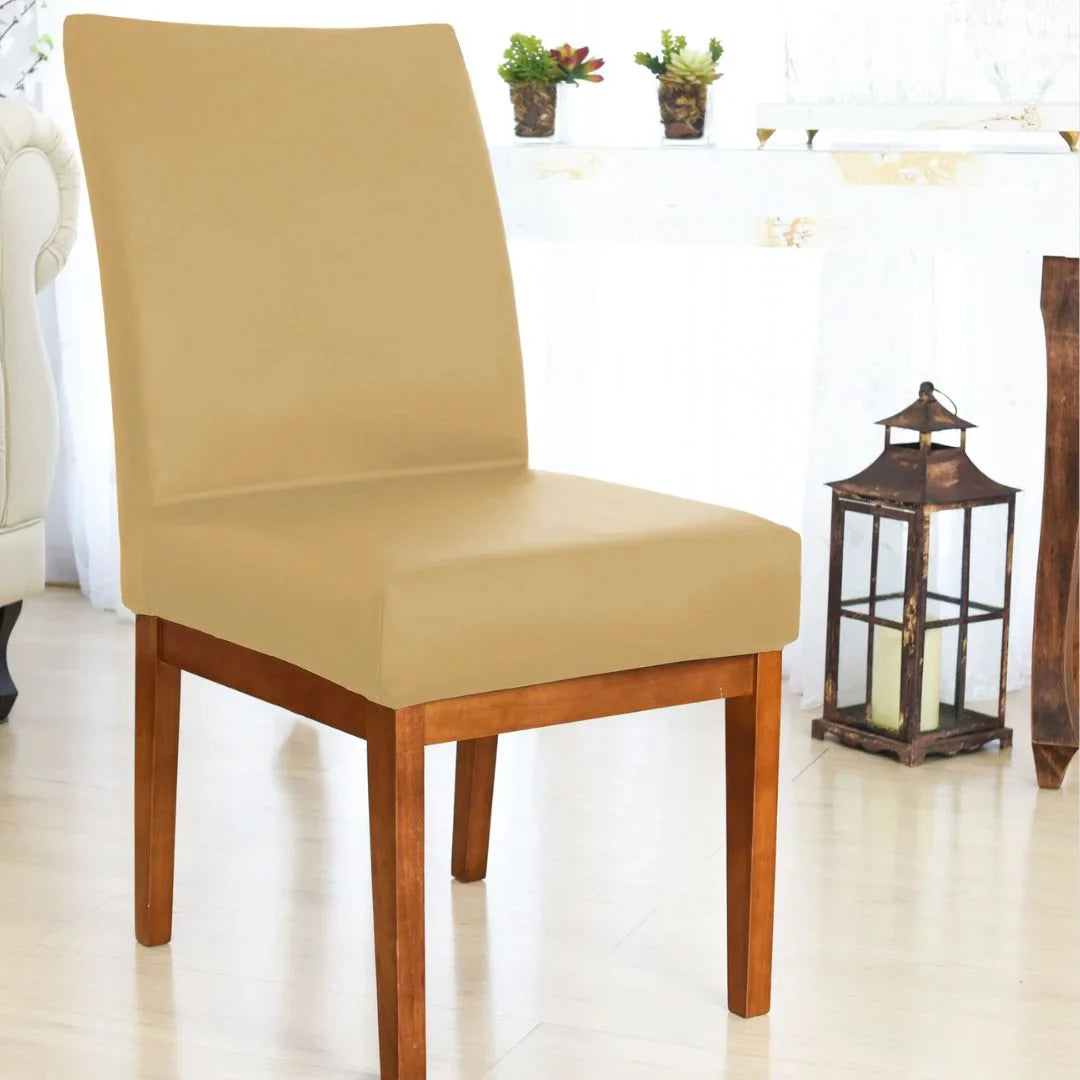 A capa para cadeira de jantar impermeável bege da Charme se adapta a diversos modelos de cadeiras.