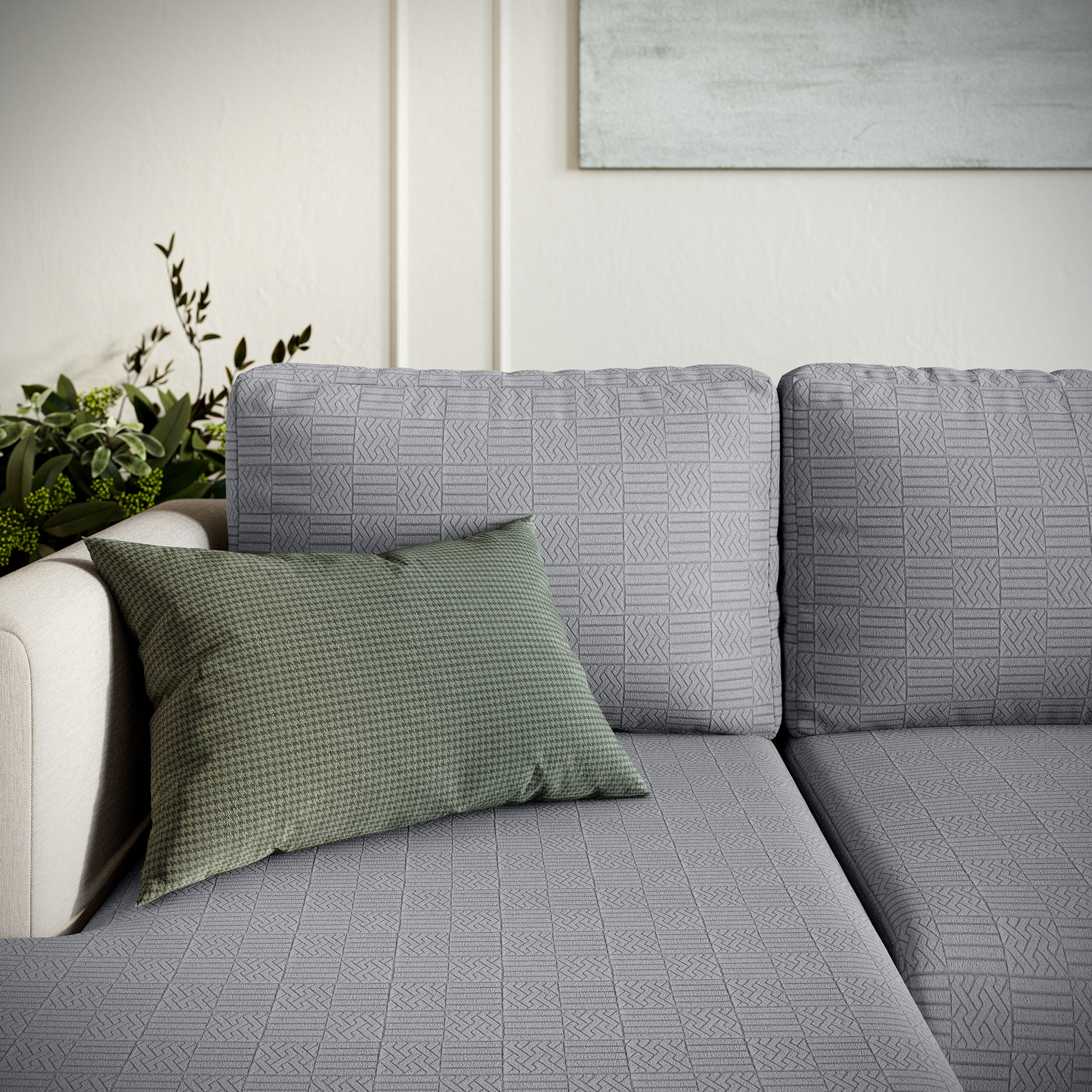 Seu design geométrico em relevo, com textura em estilo jacquard, adiciona modernidade e sofisticação ao ambiente. Durável, altamente elástico e fácil de cuidar, ele mantém seu sofá com aparência renovada.