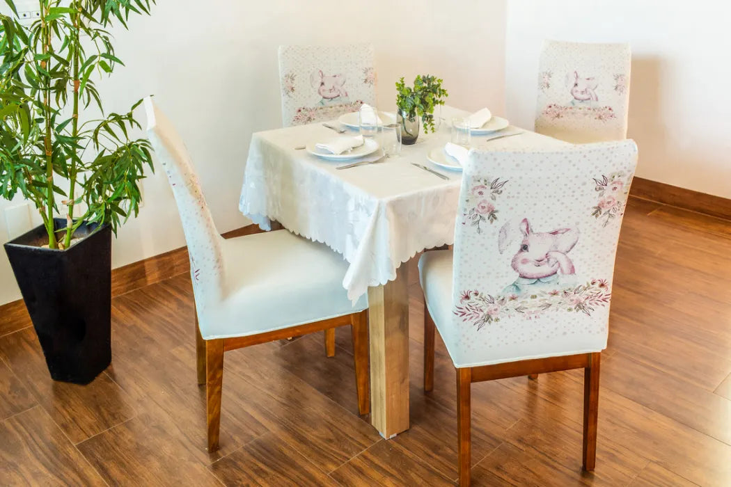 As capa de cadeira de páscoa elastex possui elástico em sua composição e se adaptam à diversos modelos de cadeiras.