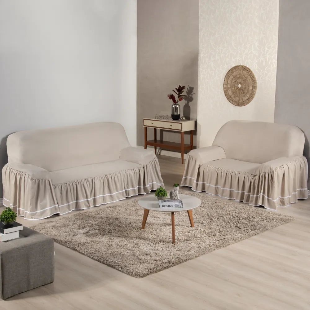 Tecido flexível que se adapta ao tamanho do sofá. As medidas do produto podem sofrer uma pequena variação entre uma unidade e outra, mas não comprometem o uso. As cores do produto podem ser levemente diferentes dependendo da tela do celular ou computador que você vê as fotos.